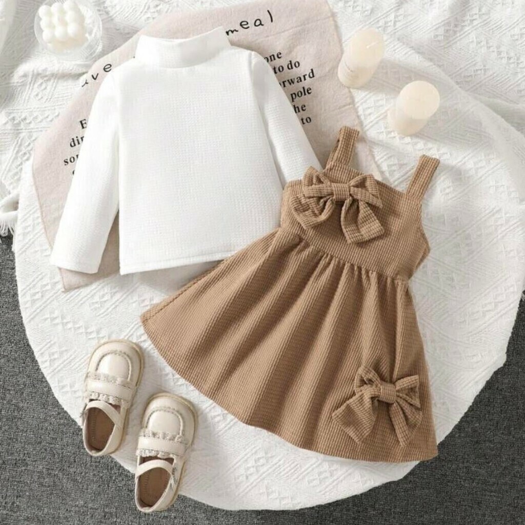 👗 Vestido Tipo Jumper en Tono Camel - Con tirantes anchos y falda con vuelo, confeccionado en pana gruesa. - Adornado con dos moños grandes, uno en el centro del pecho y otro en la parte baja de la falda, que aportan un toque adorable y elegante.